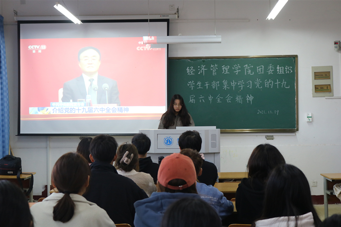 11月19日,jbo·竟博电竞官网-首页团委在1107教室组织团学干部集中学习党的十九届六中全会精神,学习会由学院团委员工副书记黄子雯主持。